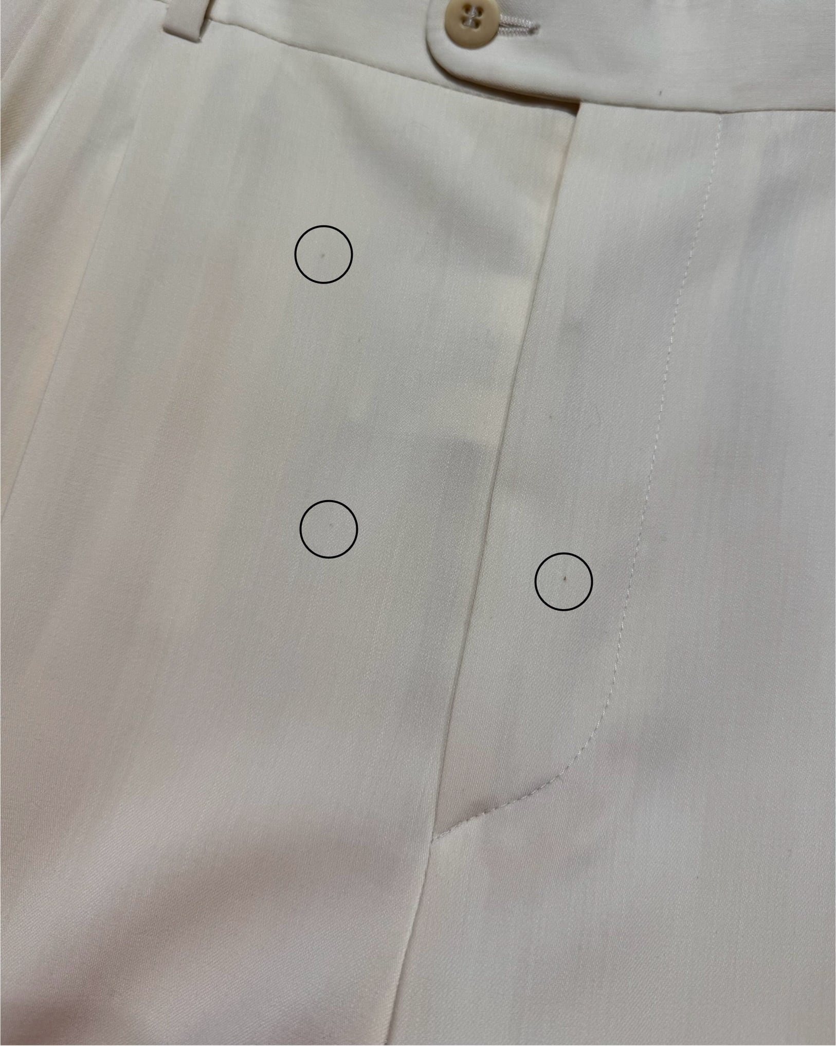 (写真5,6,7,8,9枚目)フロント股周辺/フロント左シーム付近2ヶ所/フロント左内側シーム付近/バック右ポケット横にシミあり