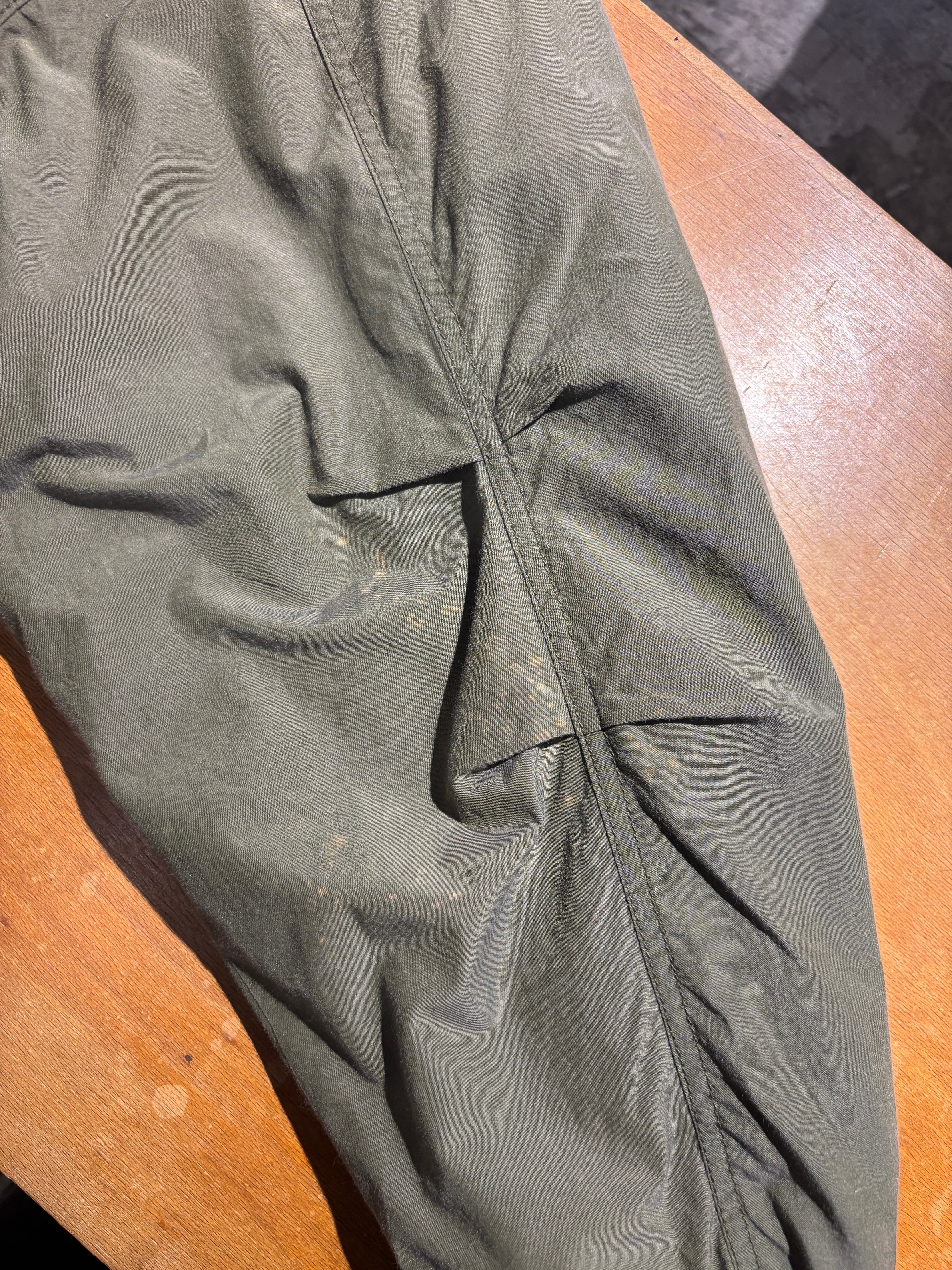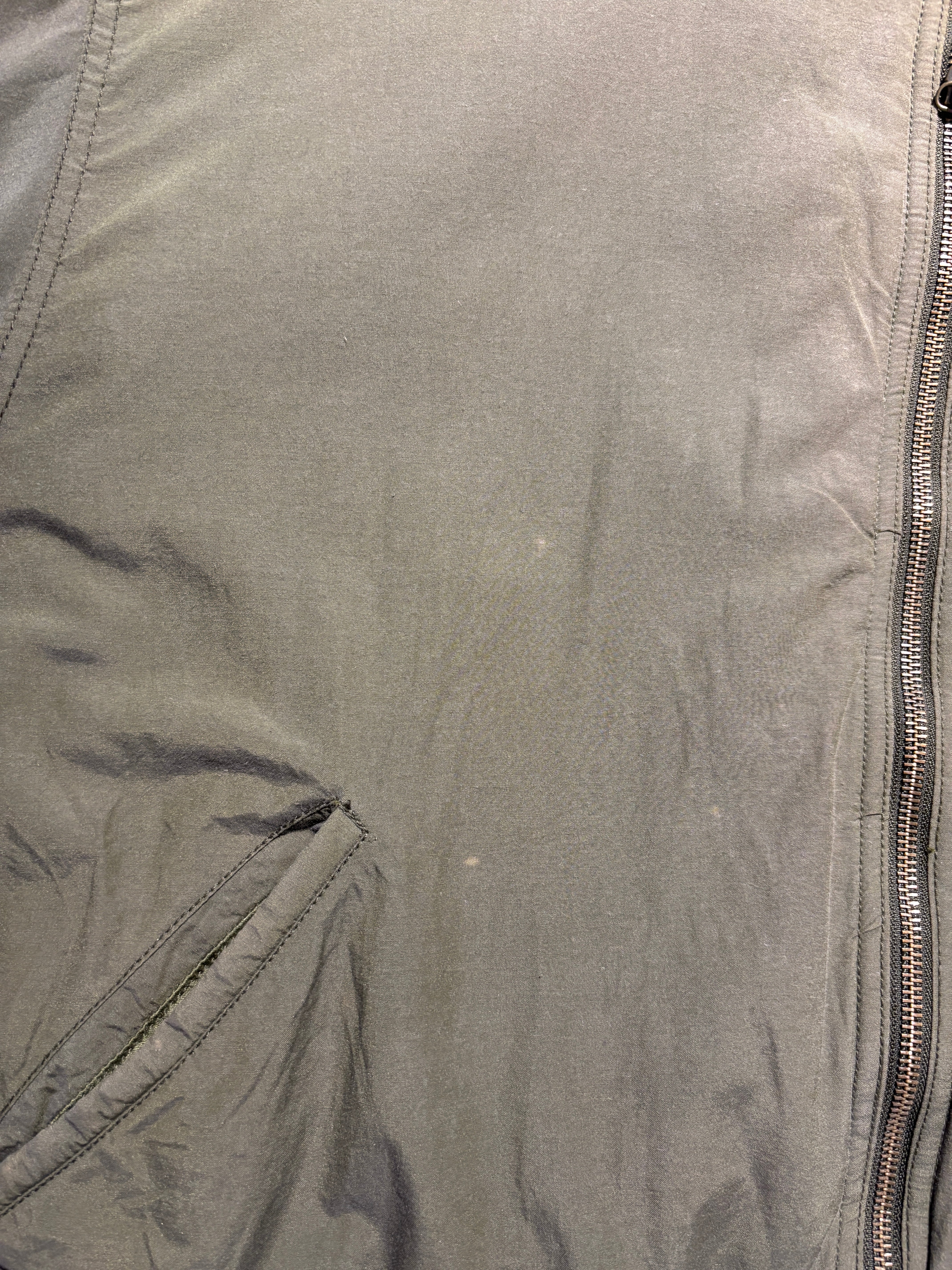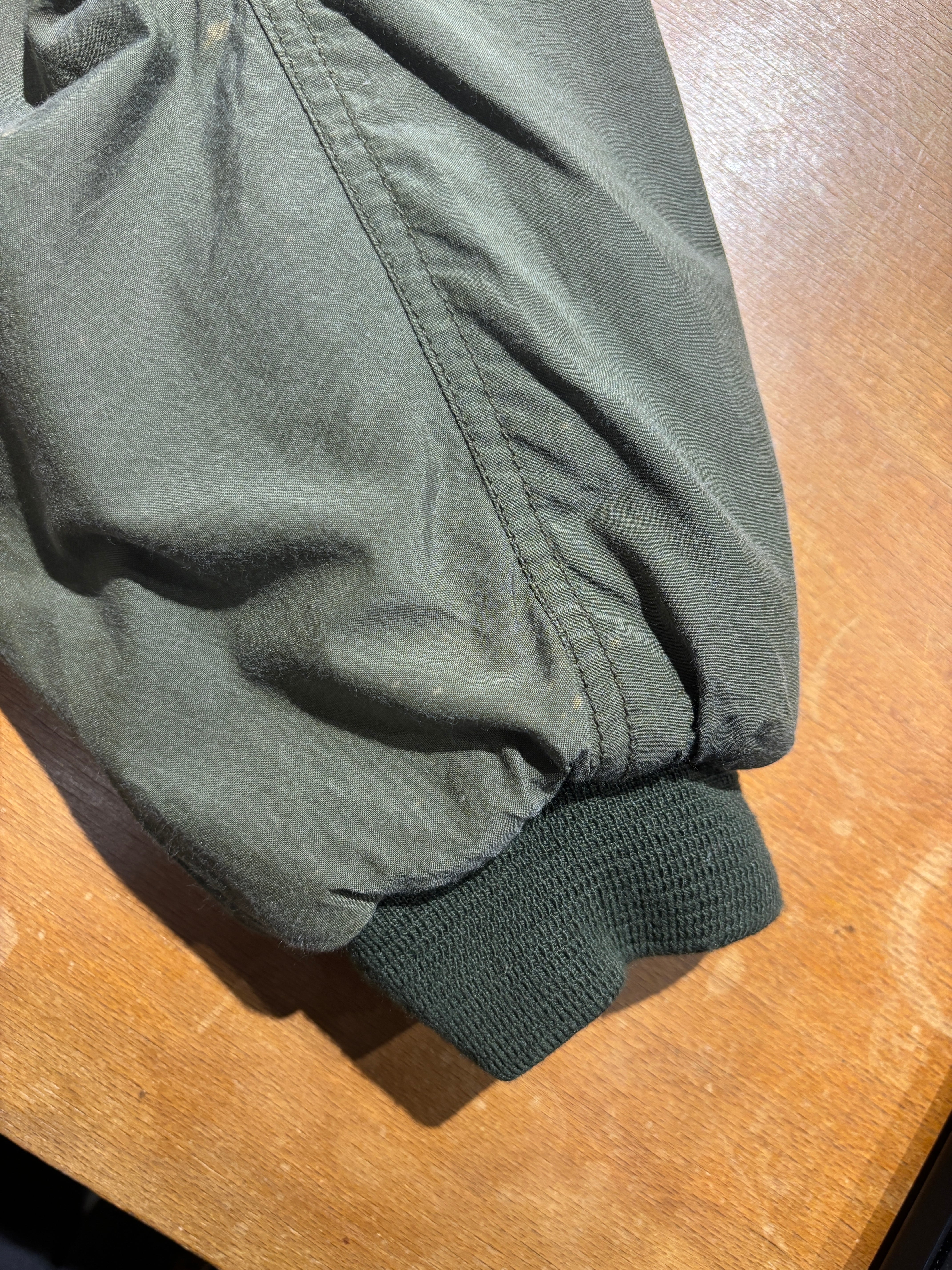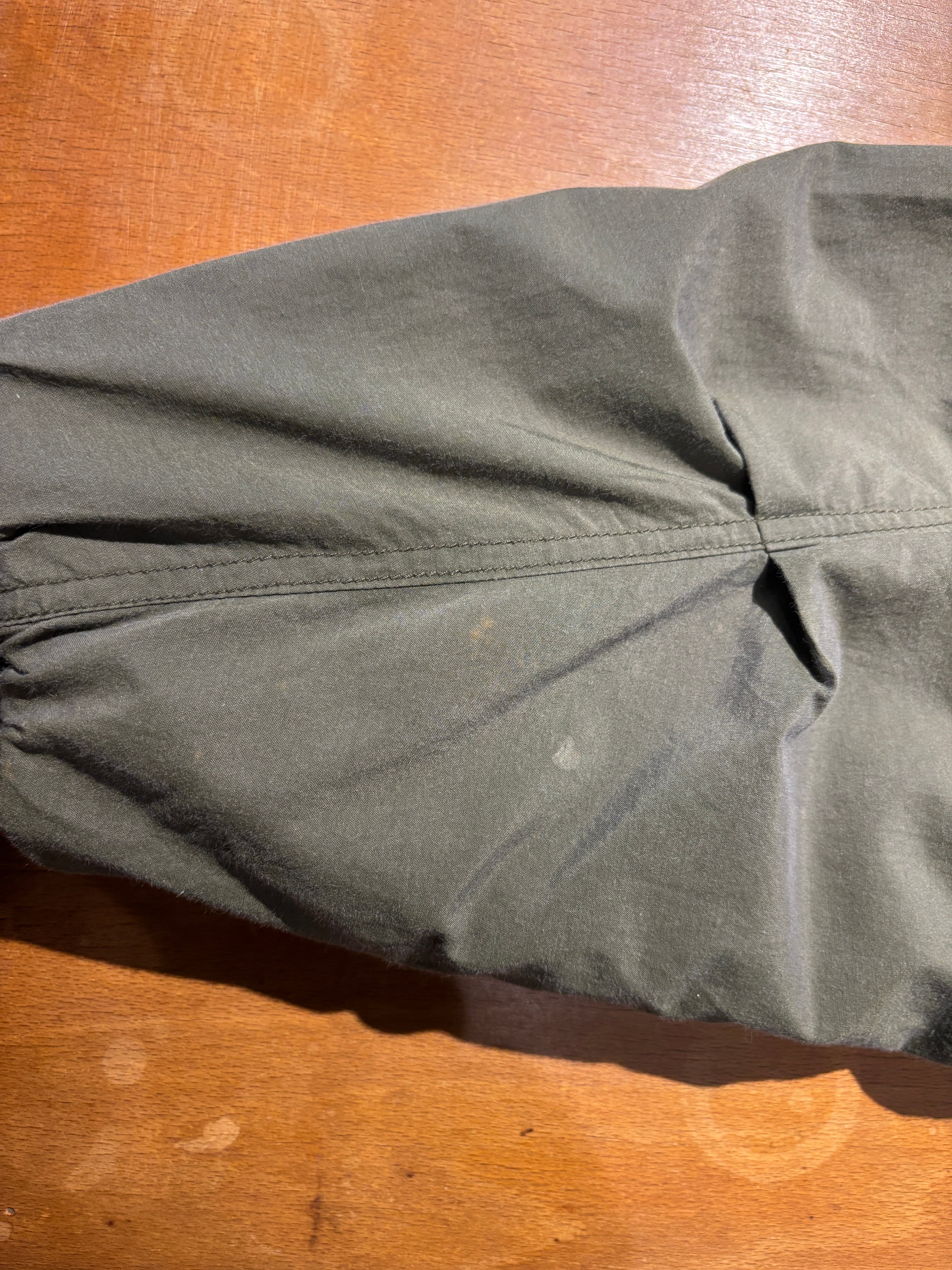 右前身頃ポケット上周辺、左袖口、右袖背面側全体にブリーチが跳ねたような脱色あります。